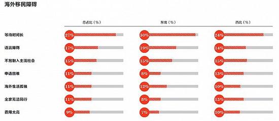 盡管對投資移民選擇感興趣,真正落實到行動上對許多高凈值人群來說還存在障礙。申請移民等待時間長連續(xù)四年被認為是最主要的路障,占比達到27%;其次是語言障礙和不易融入主流社會,占比分別達到17%和15%。認為申請困難、海外生活孤獨和全家無法同行的比例都比去年有所增長。