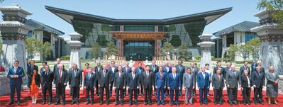 當天中午,習近平同與會領(lǐng)導(dǎo)人和國際組織負責人以國際會議中心“漢唐飛揚”主建筑為背景集體合影。